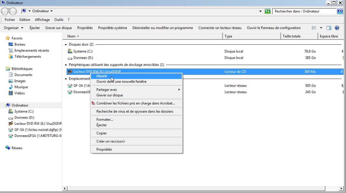 Aller dans le menu poste de travail et ouvrir l’exécutable VisuDGFiP (clic droit sur le lecteur > ouvrir) :