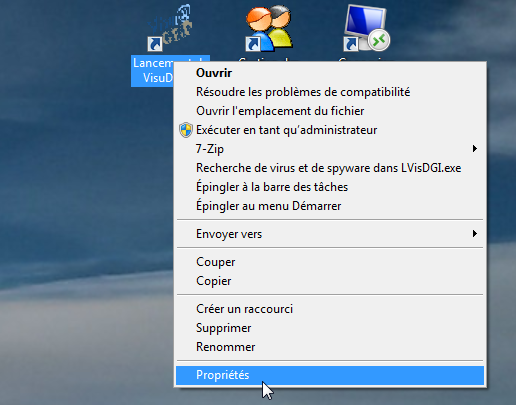 Faire un clic droit sur l’icône VisuDGFiP et choisir « Propriétés » :
