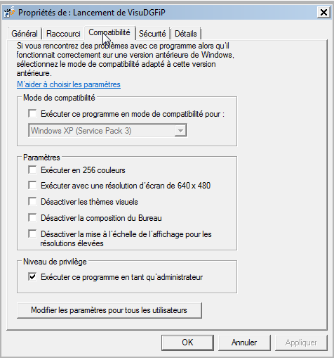 Puis, dans la fenêtre « Propriétés », cliquer sur l'onglet « compatibilité » et cocher la dernière case intitulée « exécuter ce programme en tant qu’administrateur ». Appliquer les modifications.